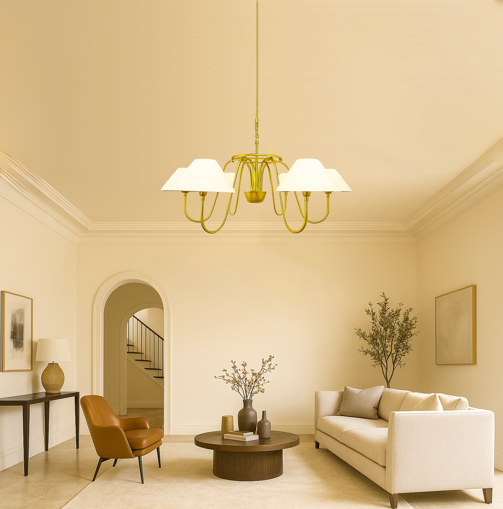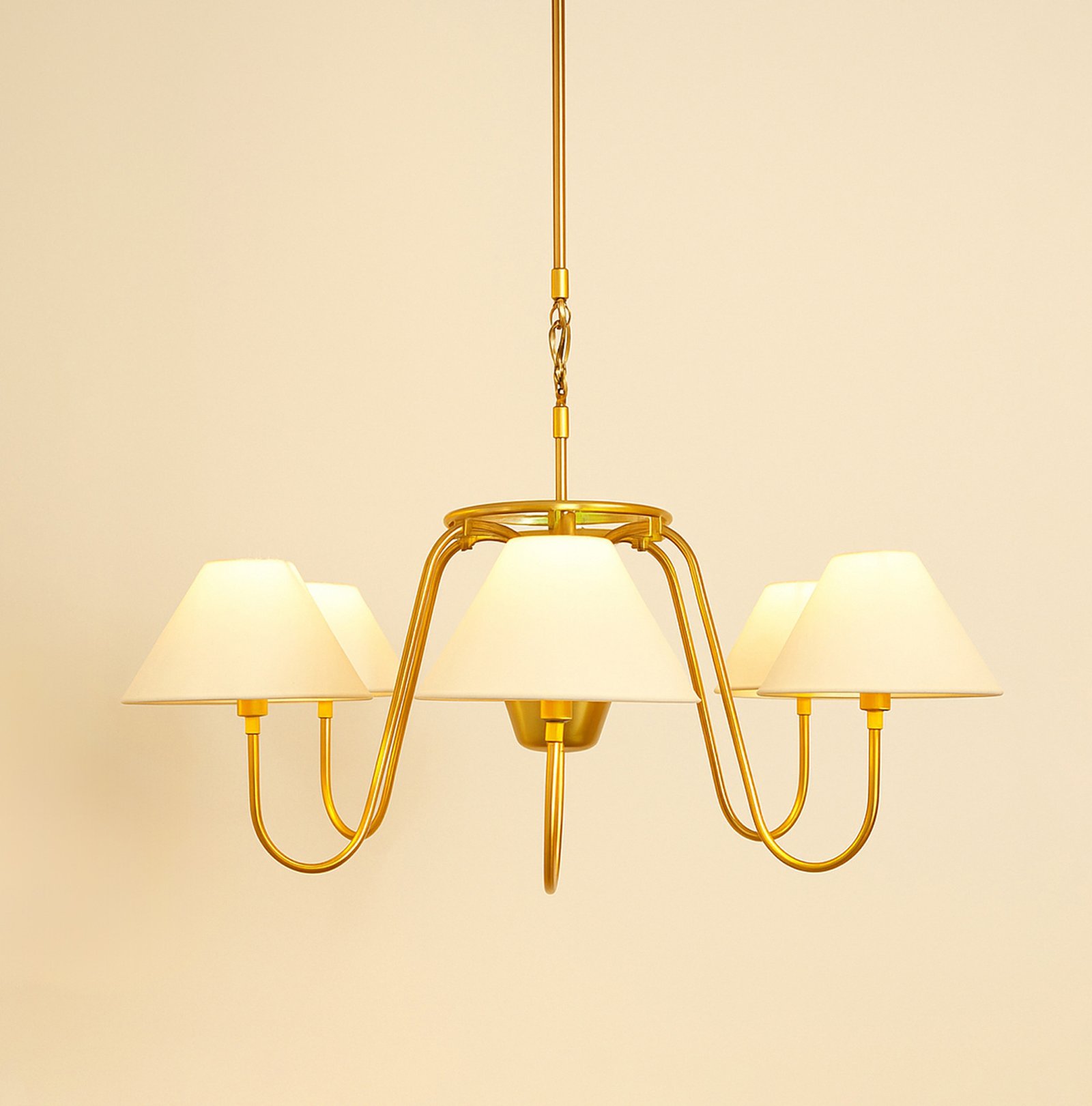 <h3 style="box-sizing: border-box; margin: 0px 0px 20px; line-height: 1.5em; font-size: 17px; font-family: "Open Sans", sans-serif; padding: 0px; color: rgb(40, 40, 40); background-color: rgb(255, 255, 255);"><span style="box-sizing: border-box; font-family: Inter, sans-serif, Zen; font-size: 18px; white-space-collapse: preserve-breaks; background-color: rgb(244, 245, 246);">Illuminate your space with this stunning Golden chandelier featuring five elegant white shades. The vibrant red finish adds a bold touch to any room, while the soft white shades diffuse light beautifully, creating a warm and inviting atmosphere. Perfect for dining rooms, living areas, or entryways, this chandelier combines modern design with classic charm, making it a versatile addition to your home decor. Elevate your interior style and enjoy the perfect blend of color and light with this exquisite lighting fixture.</span></h3>