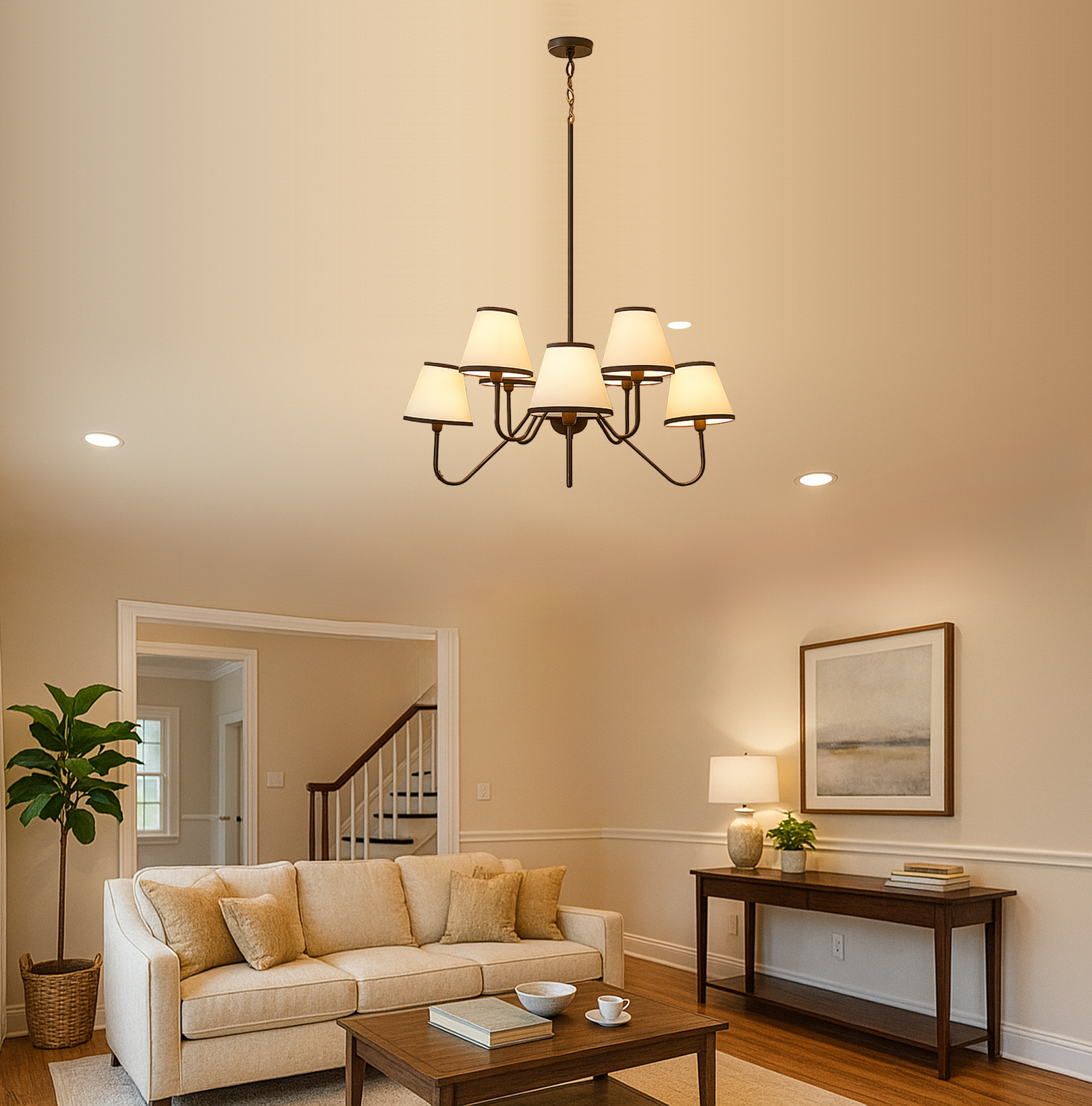 <p><span style="background-color: rgb(244, 245, 246); font-family: Inter, sans-serif, Zen; font-size: 18px; white-space-collapse: preserve-breaks; color: rgb(40, 40, 40);">Illuminate your space with this stunning black chandelier featuring five elegant white shades. The vibrant red finish adds a bold touch to any room, while the soft white shades diffuse light beautifully, creating a warm and inviting atmosphere. Perfect for dining rooms, living areas, or entryways, this chandelier combines modern design with classic charm, making it a versatile addition to your home decor. Elevate your interior style and enjoy the perfect blend of color and light with this exquisite lighting fixture.</span></p>
