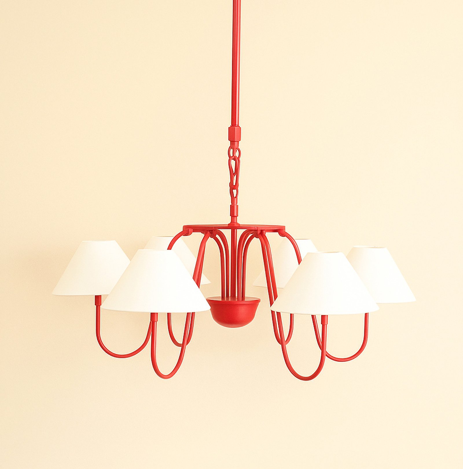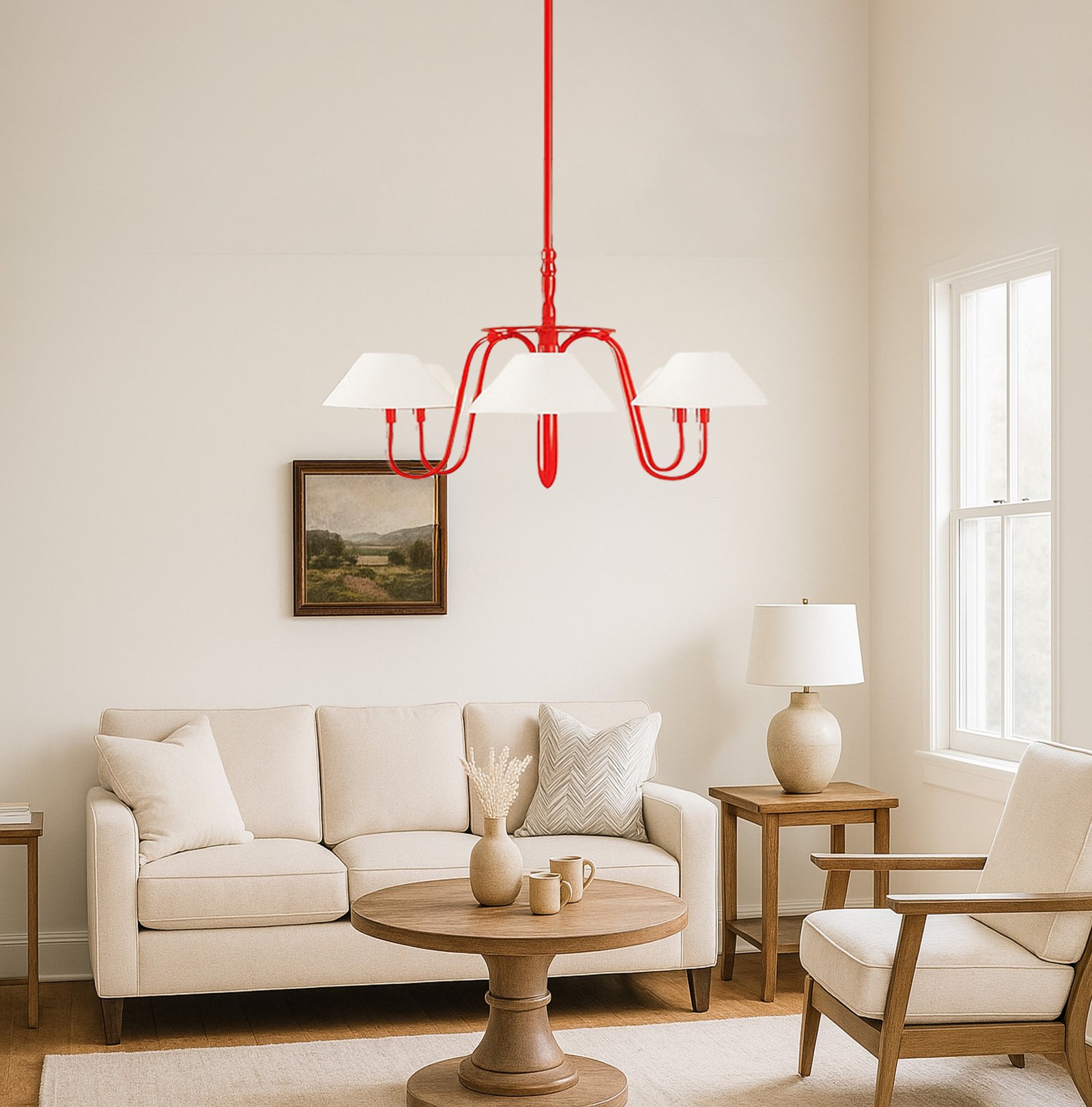 <h3 style="box-sizing: border-box; margin: 0px 0px 20px; line-height: 1.5em; font-size: 17px; font-family: "Open Sans", sans-serif; padding: 0px; color: rgb(40, 40, 40); background-color: rgb(255, 255, 255);"><span style="box-sizing: border-box; font-family: Inter, sans-serif, Zen; font-size: 18px; white-space-collapse: preserve-breaks; background-color: rgb(244, 245, 246);">Illuminate your space with this stunning RED chandelier featuring five elegant white shades. The vibrant finish adds a bold touch to any room, while the soft white shades diffuse light beautifully, creating a warm and inviting atmosphere. Perfect for dining rooms, living areas, or entryways, this chandelier combines modern design with classic charm, making it a versatile addition to your home decor. Elevate your interior style and enjoy the perfect blend of color and light with this exquisite lighting fixture.</span></h3>