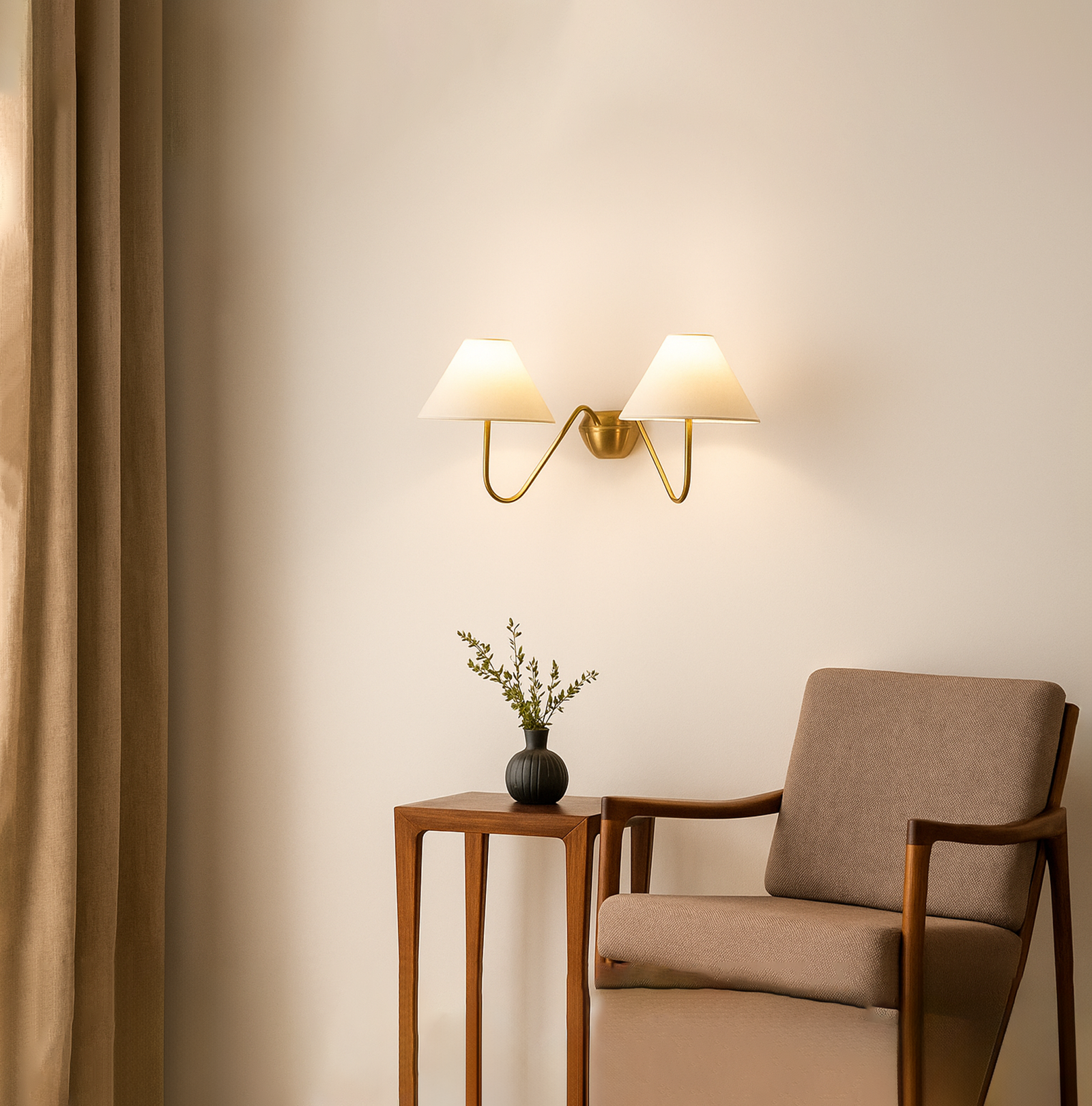 <h3 style="font-weight: normal; line-height: 1.2em; color: rgb(51, 51, 51); font-family: sans-serif, Arial, Verdana, "Trebuchet MS";">Introducing our exquisite wall lamp, a stunning addition to your home decor. With its sleek Golden color finish, this lamp exudes a sense of contemporary elegance that will enhance any space. The striking design, reminiscent of a delicate two branches, adds a touch of nature-inspired beauty to your walls. Its unique shape, gives it a charming and playful aesthetic that will surely catch the eye of your guests.</h3>